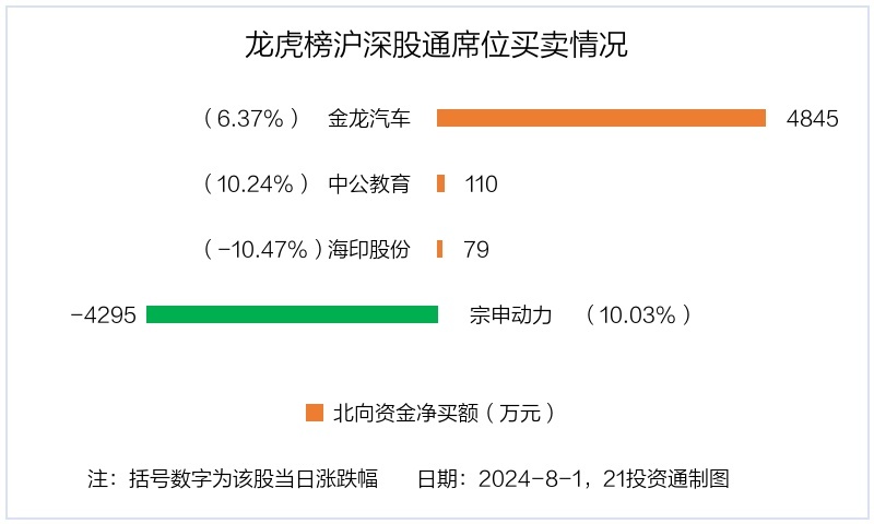 8月1日,北向资金参与龙虎榜中的个股共有4只,合计净买入738.41万元。其中沪股通净买入1股,合计净买入4844.74万元;深股通净买入2股,净卖出1股,合计净卖出4106.33万元。