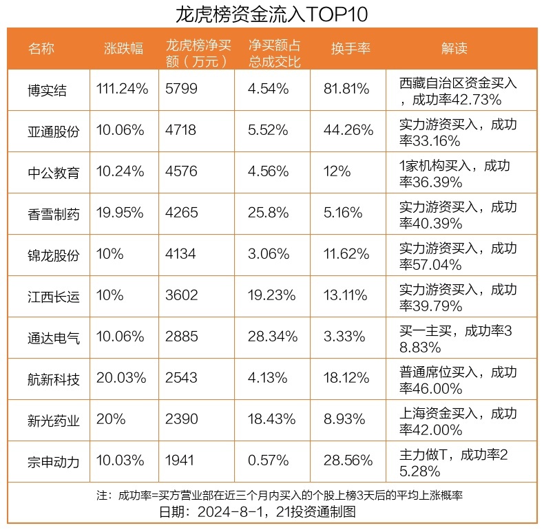 8月1日,上证指数下跌0.22%,深证成指下跌0.92%,创业板指下跌1.31%。盘后龙虎榜数据显示,共有40只个股因当日异动登上龙虎榜,资金净流入最多的是博实结(301608.SZ),达0.58亿元。