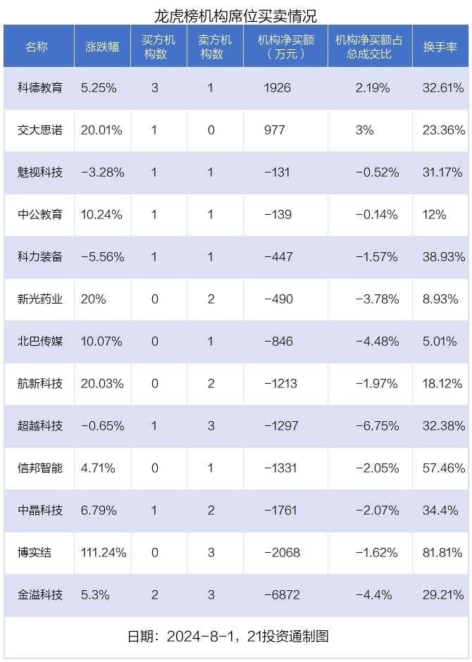 其中,机构净买入金额最多的是科德教育(300192.SZ),当日收盘上涨5.25%,换手率为32.61%。