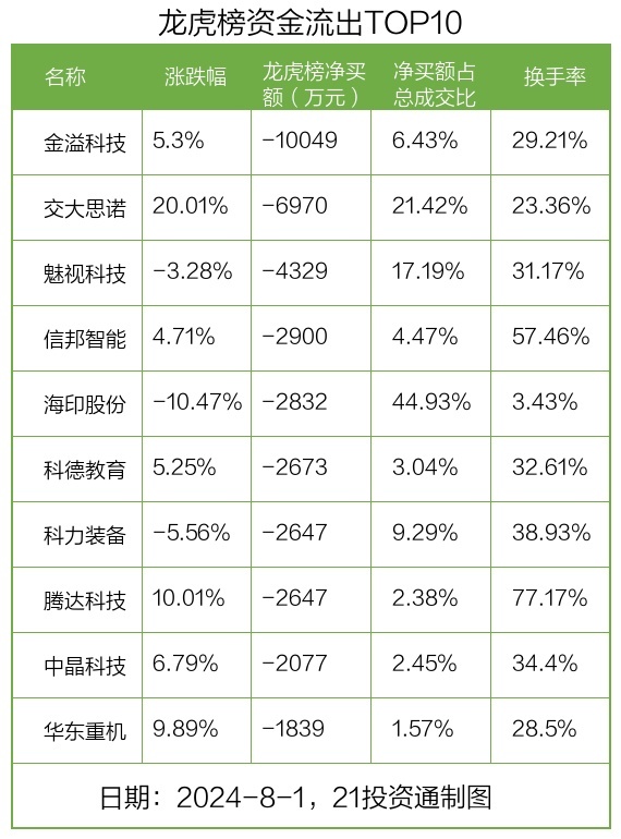 而龙虎榜中资金净流出最多的是金溢科技(002869.SZ),被净卖出为1亿元,占总成交金额的6.43%。金溢科技收盘上涨5.3%,换手率为29.21%。