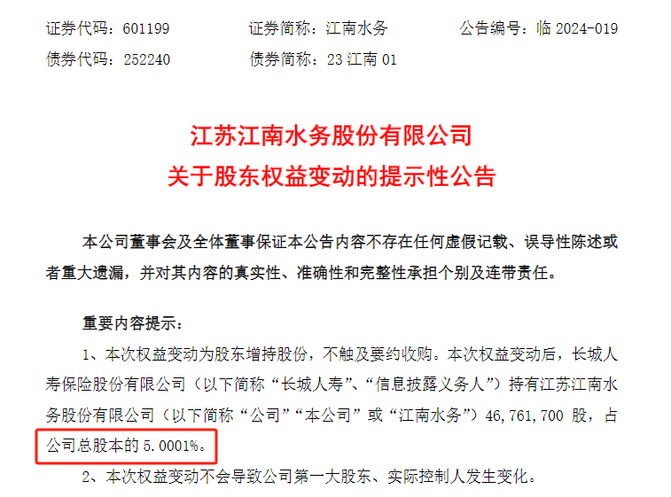 江南水务5月17日晚公告,公司当日收到长城人寿出具的《简式权益变动报告书》。截至公告,长城人寿通过二级市场增持公司股份4676.17万股,占公司总股本的5.0001%,触及“举牌线”。